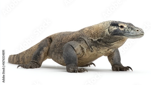 reptile, lizzard, dragon, animal, wildlife, scaly, large, powerful, prey, predator, reptilian, nature, conservation, endangered, dangerous, island, indonesia, east, asia, fauna, vertebrate, carnivorous, ancient, scale, brown, grey, profile, standing, isolated, white, background, sharpened, sharp, detail, robust, strong, threat, survival, wild, majestic, terrestrial