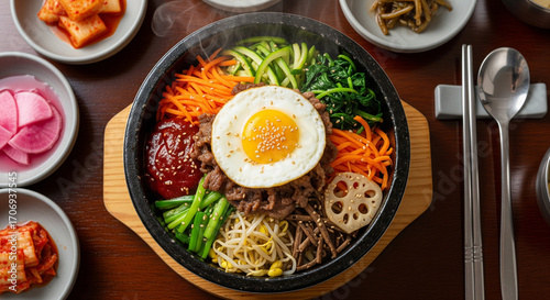 Korean bibimbap in hot stone bowl with colorful vegetables arranged artistically