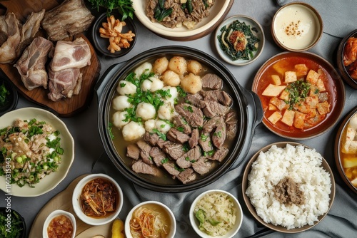 Korean cuisine featuring beef dishes like gomtang crucible soup boiled pork oxtail steamed options salted squid and kkakdugi