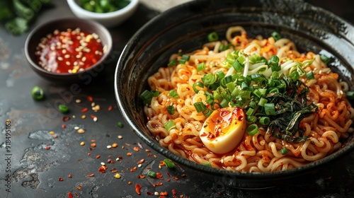 Korean food, Spicy Cold Chewy Noodles with vegetables and spicy sauce, jjolmyeon