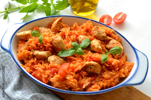Kritharaki with tomatoes and chicken. Traditional type of Greek pasta shape of rice. Greek version of Italian Orzo