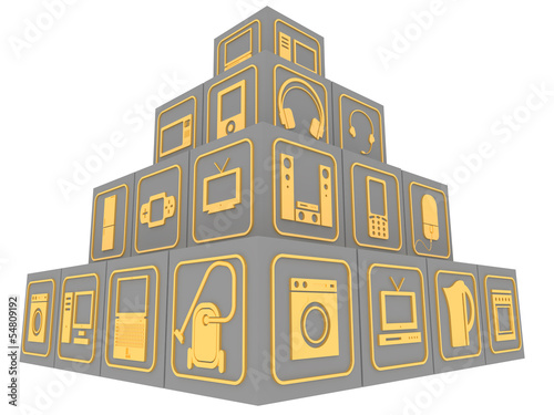 modern, technology, cube, symbol, computer, notebook, mouse, manipulator, teapot, vacuum cleaner, oven, phone, mobile, earphones, typeface, television, refrigerator, icon, pictogram, grey, yellow