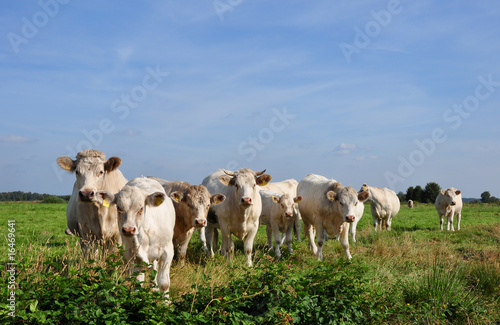 Kühe, Rinder auf der Weide unter blauen Himmel schauen neugierig