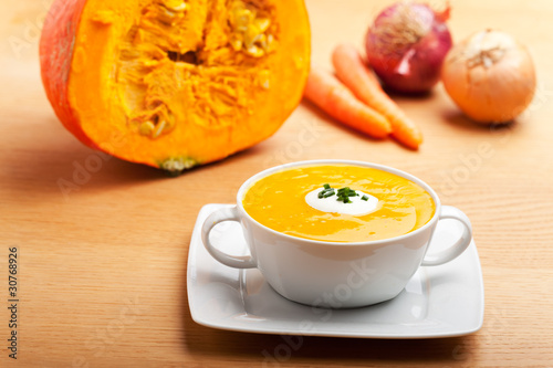 pumpkin soup, pumpkin, soup, vegetable, appetiser, autumn, season, orange, cream, yellow, fresh, autumn, plate, dish, vegetarian, garnished, tasty, natural, boiled, white, food, chives, handle, meal, colourful, cup, food, liquid