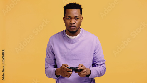 KYIV, UKRAINE - NOVEMBER 22, 2019: focused african american man playing video game isolated on yellow.