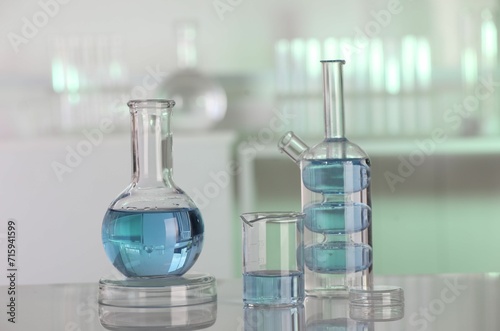 Laboratory analysis. Different glassware with liquid on white table against blurred background