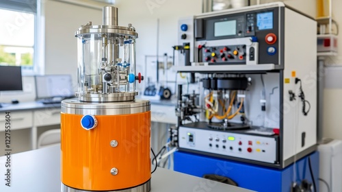 laboratory, research, equipment, scientific, development, glassware, machinery, test, experiment, synthesis, analysis, innovation, tech, engineering, setup, process, safety, precision, control, component, modern, interior, workspace, automation, technology, instrumentation, desktop, tool, measurement, calibration, quality, production, efficiency, design, orange, blue, background, facility, science, apparatus, functionality, environment, operation, electronic