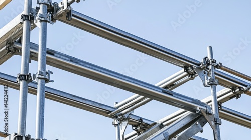 Laborer adjusting scaffolding on a building site. Featuring safety and building support