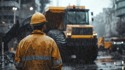 Labour work on construction side in Havey Rain Construction worker is standing in the rain in front of large construction vehicle