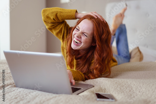 woman, laptop, laugh, fun, surprise, mad, funny, silly, witty, video, notebook computer, bed, lie, feeling, expression, positive, home, computer, online, contented, cyberspace, surf, web, web, networked, home, ceiling, curl, red hair, pleasant, bedchamber, pretty, beauty, room, interior, person, man, female, freckle, white, smile, 20s