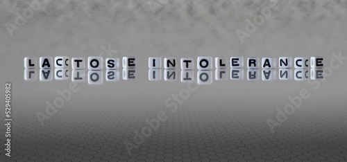 lactose intolerance word or concept represented by black and white letter cubes on a grey horizon background stretching to infinity