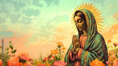virgin mary, illustration, religious, catholic, mexico, spirituality, divine, sacred, icon, miraculous, cultural, symbolism, faith, halo, rose, guadalupe, traditional, latin america, veneration, prayer, holiness, grace, blessed, holy, reverence, heavenly, protection, maternal, pilgrimage, sacred heart, celestial, ornate, baroque, heritage, miracle, worship, devotion, spiritual