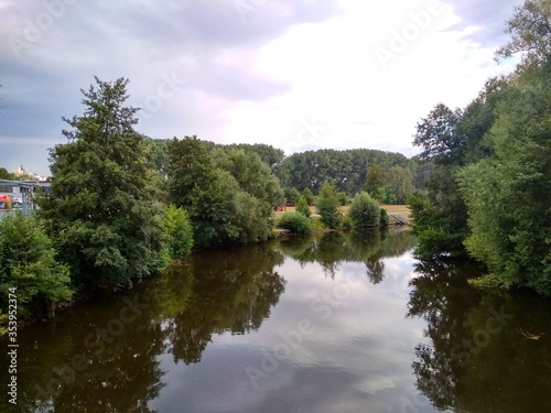 water, river, sky, nature, lake, landscape, summer, tree, forest, green, blue, tree, cloud, grass, cloud, duck pond, park, beautiful, outdoors, view, scene, wood, tranquil, rural