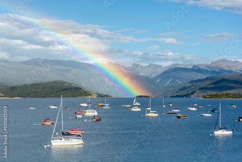 Lake Granby, Colorado with boats and a rainbow on a sunny day