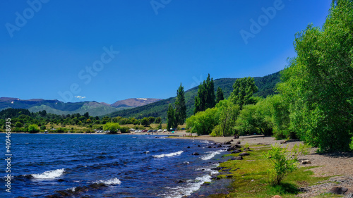 Lake Lolog landscape on a summer warm afternoon under a blue sky. San Martin de los Andes, Neuquen, Argentina