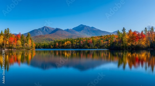 lake, reflecting, tree, autumn, mountain, standing, forest, blue, clear, natural, scenic, landscape, water, foliage, peak, hill, range, colours, sky, day, season, travel, environment, wilderness, panorama, idylli, calm, fall, wood, shore, pine, plant, horizon, tranquil, surface, view, quiet