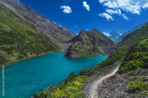 Lake with blue clear clear water in the mountains in summer. Koksai Ainakol Lake in Tien Shan Mountains in Asia in Kazakhstan