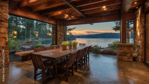 lake, dining, room, interior, view, sunset, wooden, table, chair, stone, glasses, modern, rustic, expansive, tranquil, elegant, cosy, open, contemporary, ambience, warm, light, large, roomy, panoramic, calm, nature, inside, relaxing, evening, peaceful, beautiful, design, architecture, luxury, comfort, home, property, natural, lighting, landscape, setting
