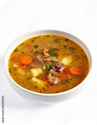 Lamb broth with spices in ceramic bowl isolated on white background for Middle Eastern or hearty food concept