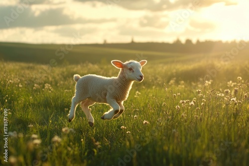 countryside, springtime, farm animal, outdoors, pastoral, jumping, across, animal, beauty, mammal, meadow, nature, spring, sunset, field, green, light, photo, scene, sheep, image, lamb, joy, joyful