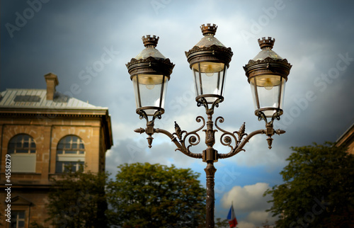 lamp, light, lamp-post, post, pole, metal, glasses, decorative, sky, blue, cloud, building, paris, france, europa