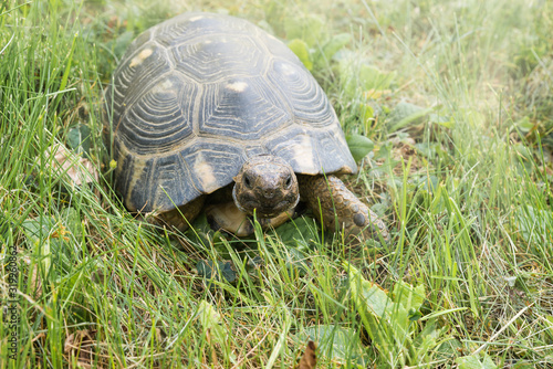 Land turtle in the meadow. Marginated tortoise or Margined turtle (Testudo marginata sarda), the largest European tortoise
