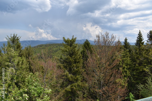 landscape, forest, sky, nature, mountain, tree, green, blue, mountain, cloud, summer, tree, grass, view, panorama, hill, vale, autumn, day, outdoors, wood, beautiful, pine, wood, scene