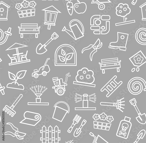 landscape design, background, seamless, garden, plain, grey background, vector, flat, land, plot, construction, flower garden, flowerbed, lawn mower, shovel, tool, rake, seed, hose, water, watering can, bucket, shoe, birdhouse, furniture, flower, greenhouse, plan, fence, lantern, cart, bench, shrub, tree, germinating, pruning shears, ladder, grey, slim, line