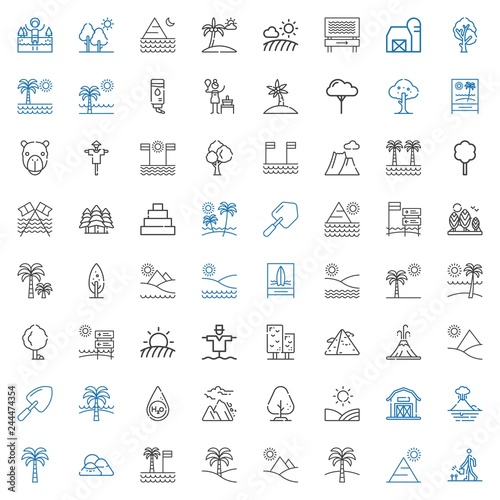 landscape, icon, set, vector, watering, pyramid, palm, tree, mountain, volcano, barn, field, avalanche, water, beach, shovel, scarecrow, forest, camel, birch, lake, illustration, symbol, signs, isolated, design, nature, graphic, line, black, summer, logotype, element, abstract, travel, background, shape, concept, silhouette, natural, season