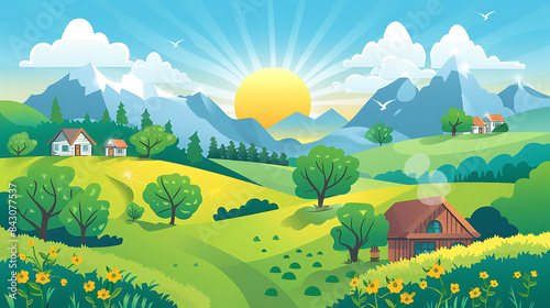 landscape, illustration, nature, field, hill, sky, scenery, mountain, countryside, cloud, leisure, travel, background, season, plant, wallpaper, terrain, banner, flat, hand-painted, poster, white cloud, environment, tree, forest, grass, view, vale