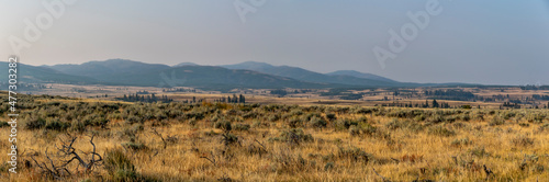 Landscape in Yellowstone National Park on a sunny day smoke from wildfires visible in the background