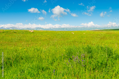 Landscape of Armenia view on snow-capped mountains and green field in June
