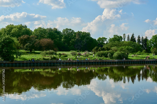 landscape, water, reservoir, duck pond, lake, river, parapet, people, recreation, sky, tree, cloud, green, blue, grass, lawn, shore, hobby, walk, summer, heat, park, square, forest, sun tanning, day, air, happiness, bright, bush, natural, ecology