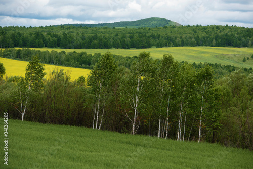 landscape of yellow rape flowers and green forest in Hulunbuir