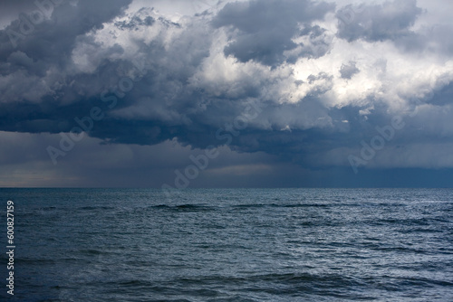 Landscape photo of dark grey thunderstorm clouds over the sea