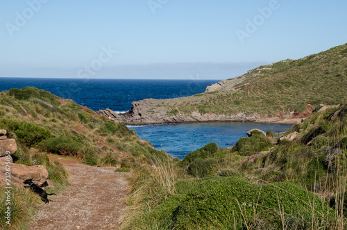 Landscape photography of one of the best known beaches of Menorca with its characteristic red earth. And a dog.