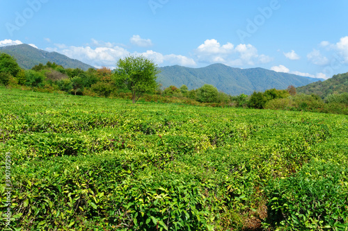 landscape view of a tea plantation on a summer day in the sun. Nature background.
