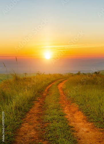 Landscape view of countryside dirt road path crosses the hills with sunset sky background.