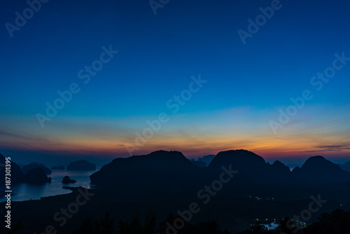 Landscape Viewpoint Phang Nga Bay highlight of Phang Nga Province,Thailand. Silhouette mountains and islands around mangrove forest at early morning sunlight.
