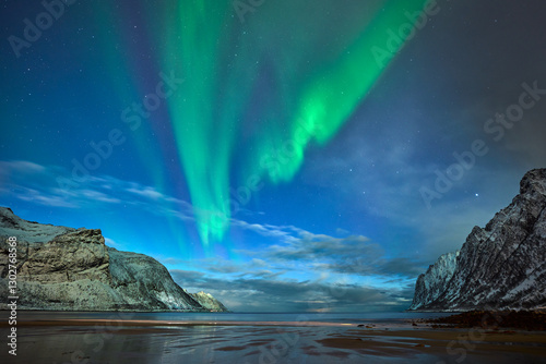 landscape with awesome polar lights in the Ersfjorden on Senja Island in northern Norway