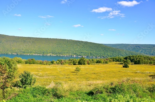 Landscape with lake and mountains, in the Finger Lakes region, New York. Early autumn scene