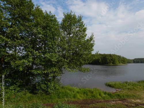 Landscape with lake and surrounding green trees, Kamień, Poland