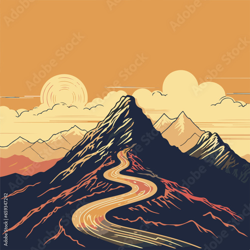 landscape, illustration, desert, vector, sunset, sun, mountain, sky, nature, mountain, summer, sand, travel, water, tree, orange, cloud, sea, cloud, sunrise, hill, horizon, silhouette, design, dune