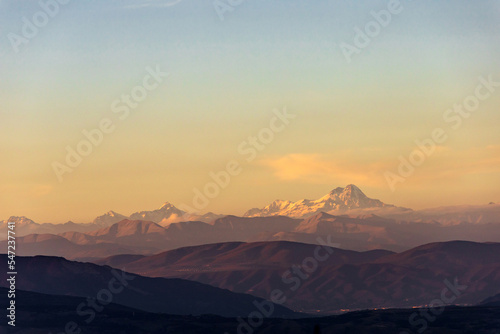 landscape with the peak of Mount Kazbek on the horizon in the rays of the setting sun