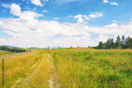 lane through grassy meadow. green hills rolling in to the distance. blue sky above the distant mountain ridge on the horizon. rural tourism in summer. explore countryside of ukraine