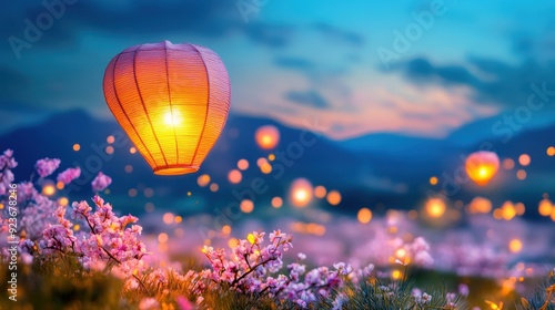 Lanterns soaring over a vast field of blooming cherry blossoms at night