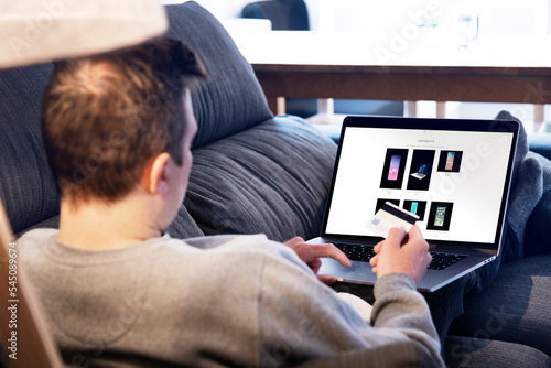 keyboard, credit card, money, couch, man, laptop, notebook computer, computer, business, home, person, technology, online, cyberspace, online, website