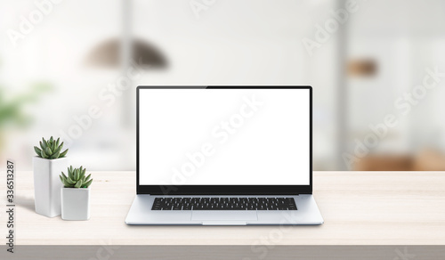 Laptop mockup on work desk. Office desk, business composition. Isolated screen for app or web site design presentation. Scene creator with isolated layers