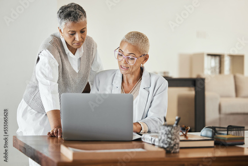 Laptop, office and senior business women in collaboration planning a corporate project together. Teamwork, professional and elderly manager helping a mature employee with a report in the workplace.