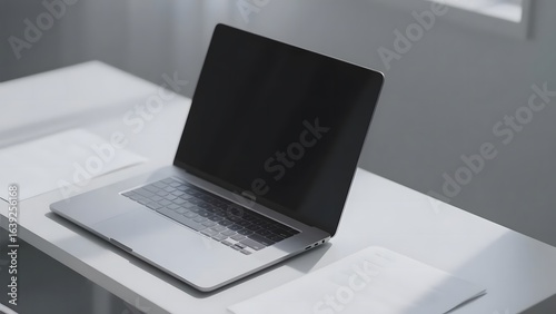 laptop, desk, paper, office, minimalist, workstation, technology, workspace, indoor, screen, keyboard, document, table, clean, modern, professional